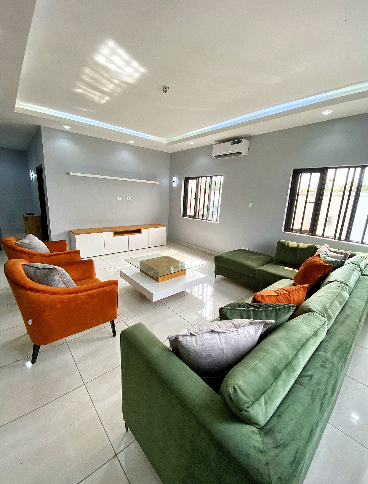 Green and orange, cleanable fabric sofa set